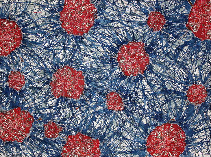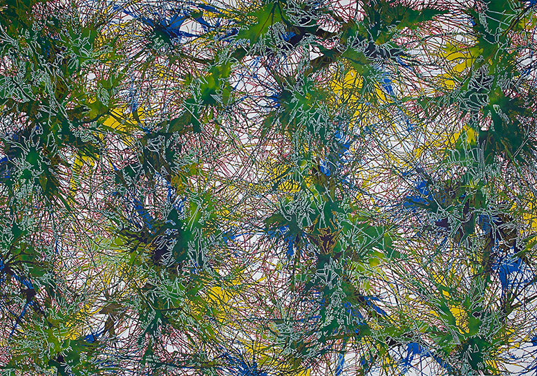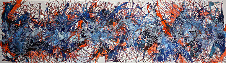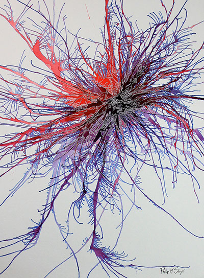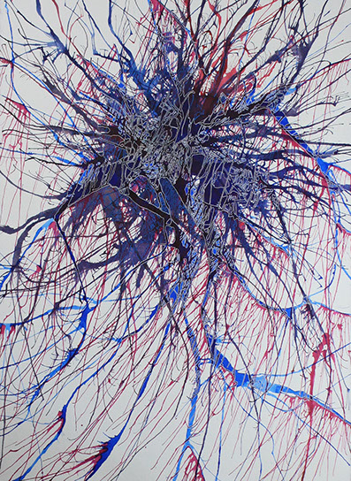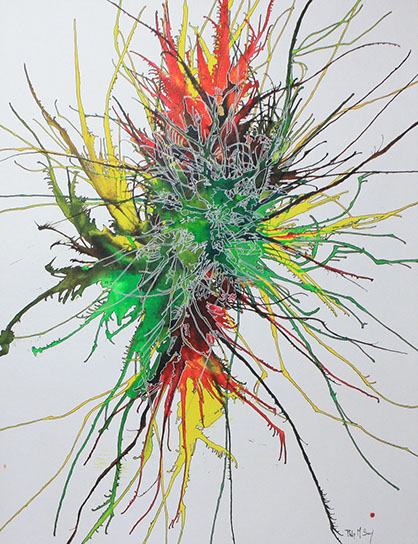 Tibetan monks spend weeks meditating on a single thought while creating intricate mandalas out of sand only to destroy them with gusts of air; my work plays to the opposite of this practice: a gust (or breath) creates the design, then weeks are spent illuminating those moments. For the monks, the thought illuminates form; in my work, form illuminates thought.