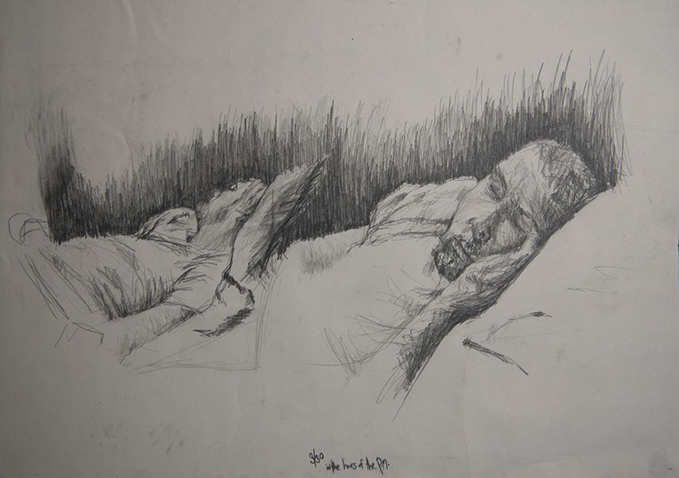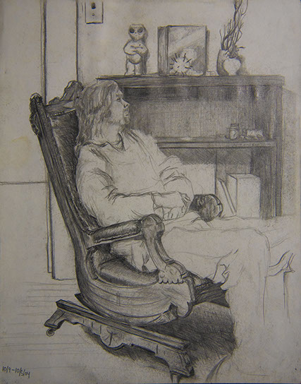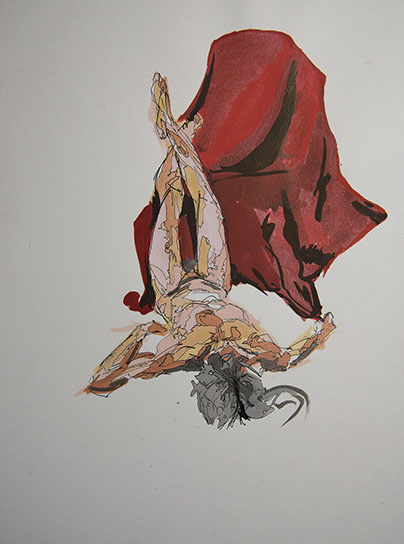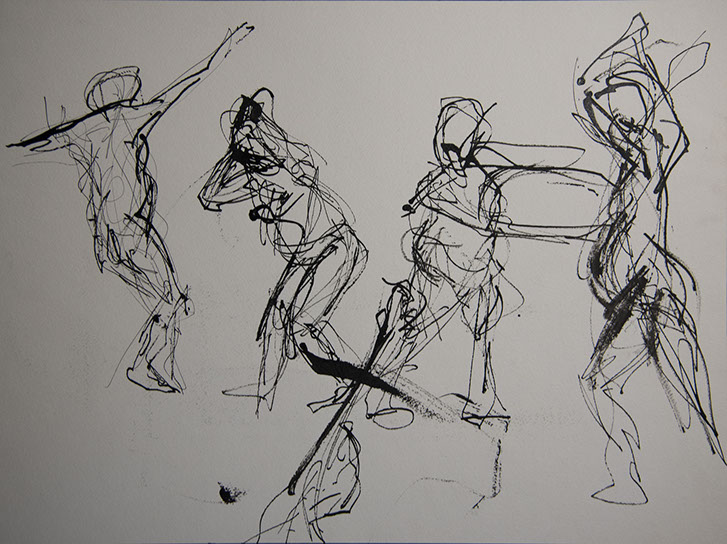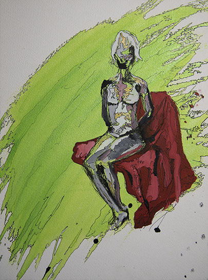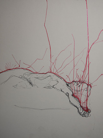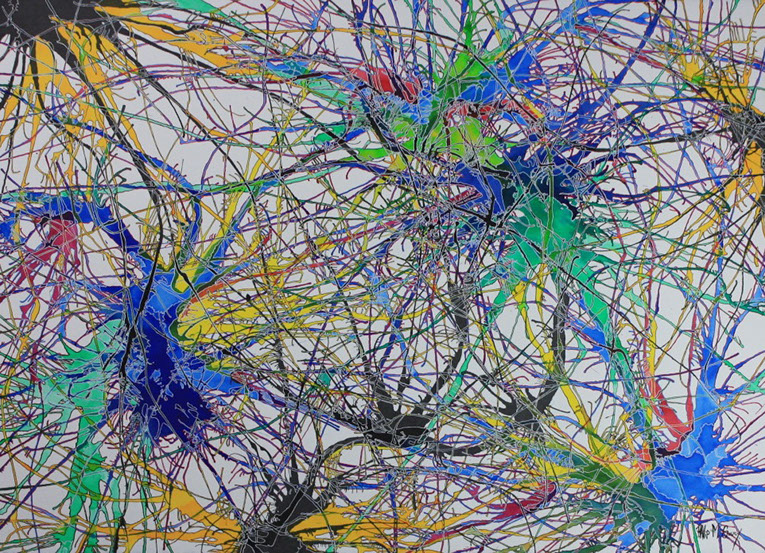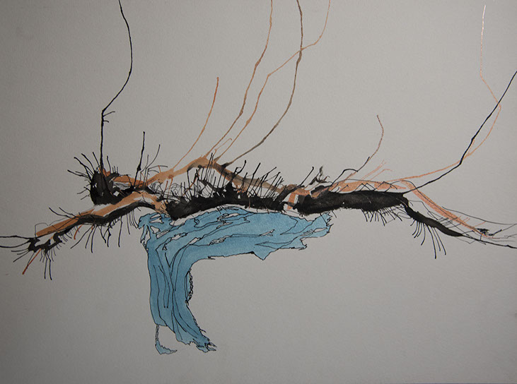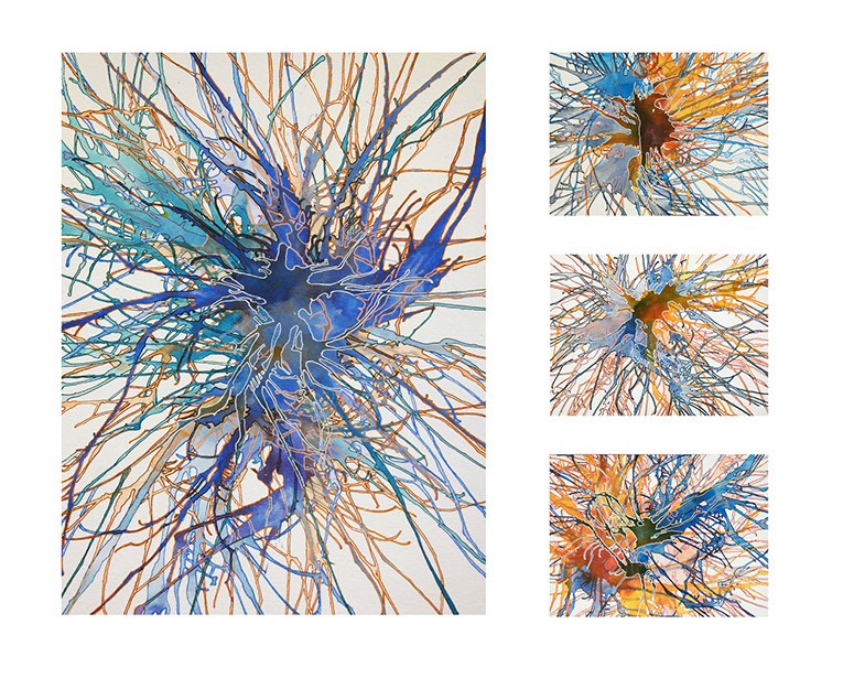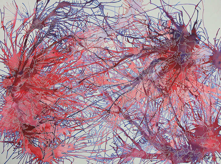 "Lines of Breath" explores the effect of breath and momentary presence through mixed media, most notably watercolor and ink. The work serves as a record of each breath, each moment, during its own creation, illustrating the process of thought, with later outlines and layers highlighting and sharpening the inherent twists and turns.